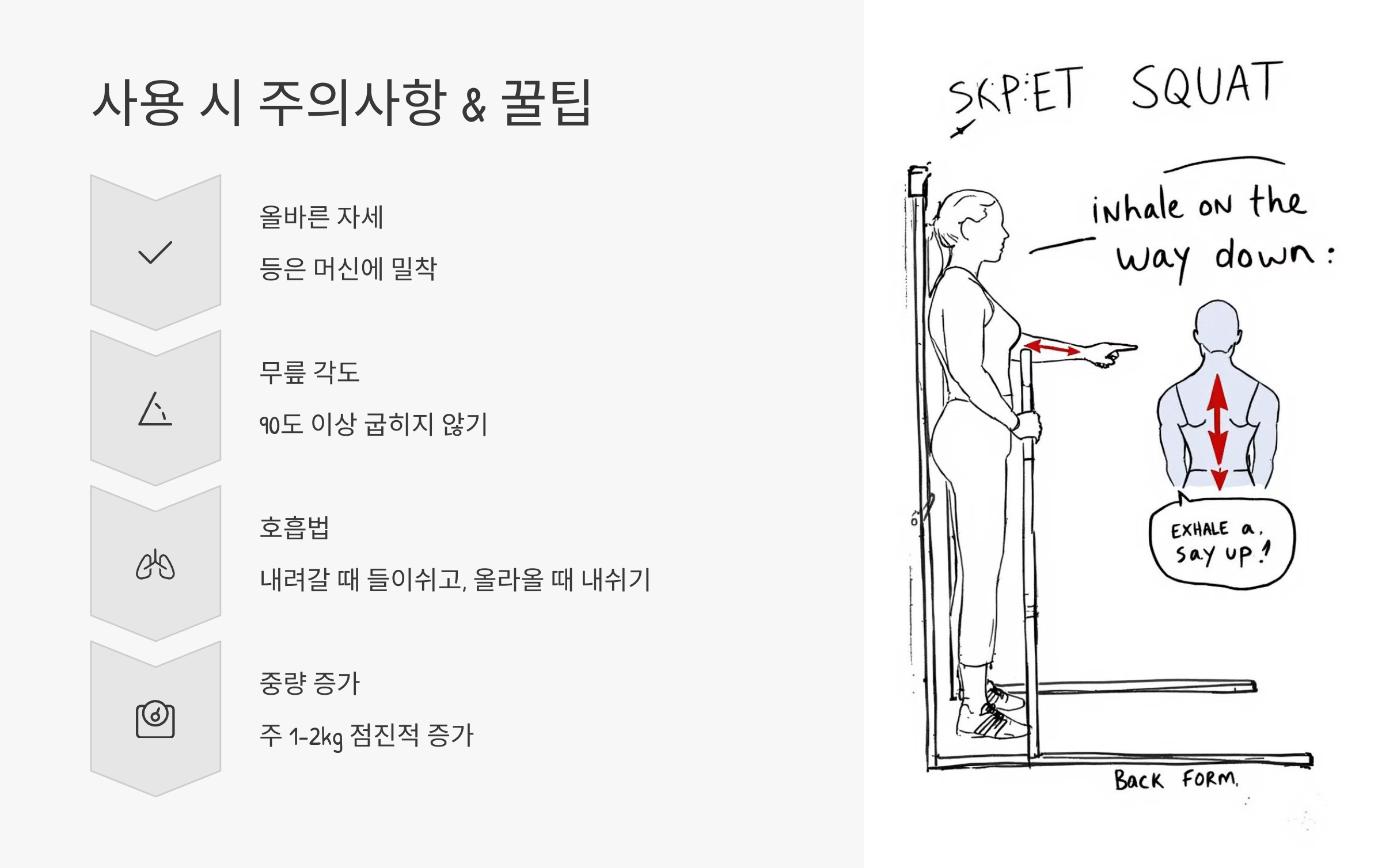 스쿼트 머신은 도와주는 도구일 뿐, 올바른 사용법이 가장 중요해요. 내 몸에 맞는 각도, 템포, 무게로 운동하면 부상 없이 예쁜 하체 만들 수 있어요! 💯