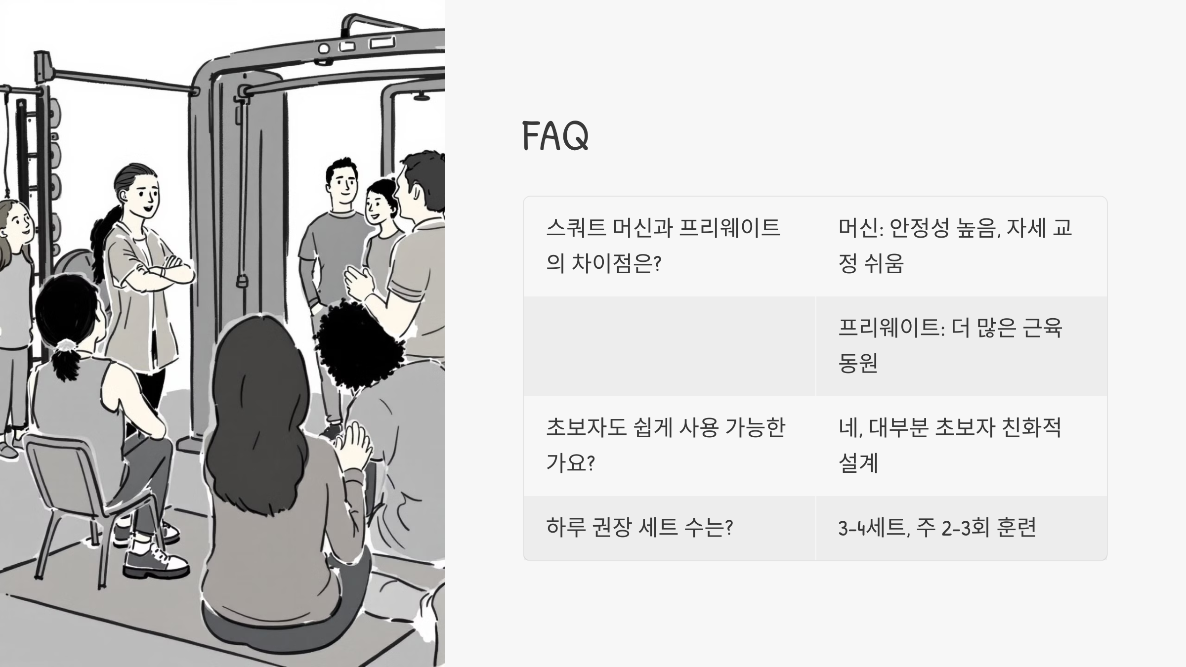 A4. 머신은 자세 보정과 안정성 강화에 유리해요. 특히 초보자는 머신을 통해 바른 폼을 익히고 나서 맨몸 스쿼트를 해보면 훨씬 효율적이에요.