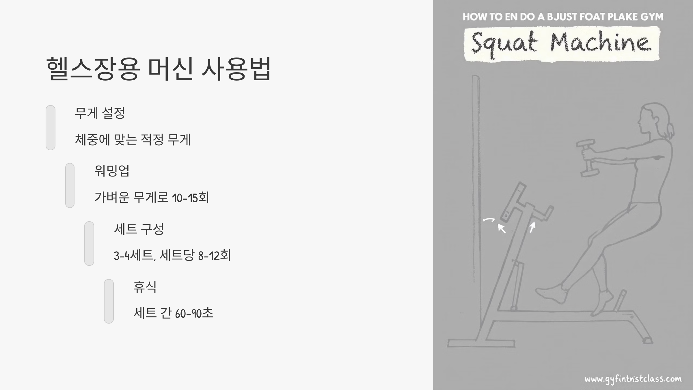 헬스장에서는 스쿼트 머신을 무조건 무겁게 사용하는 것보다, 자세 교정+자극 집중에 중점을 두는 게 훨씬 효과적이에요! 트레이너가 있다면 꼭 동작 피드백도 받아보세요. 😊