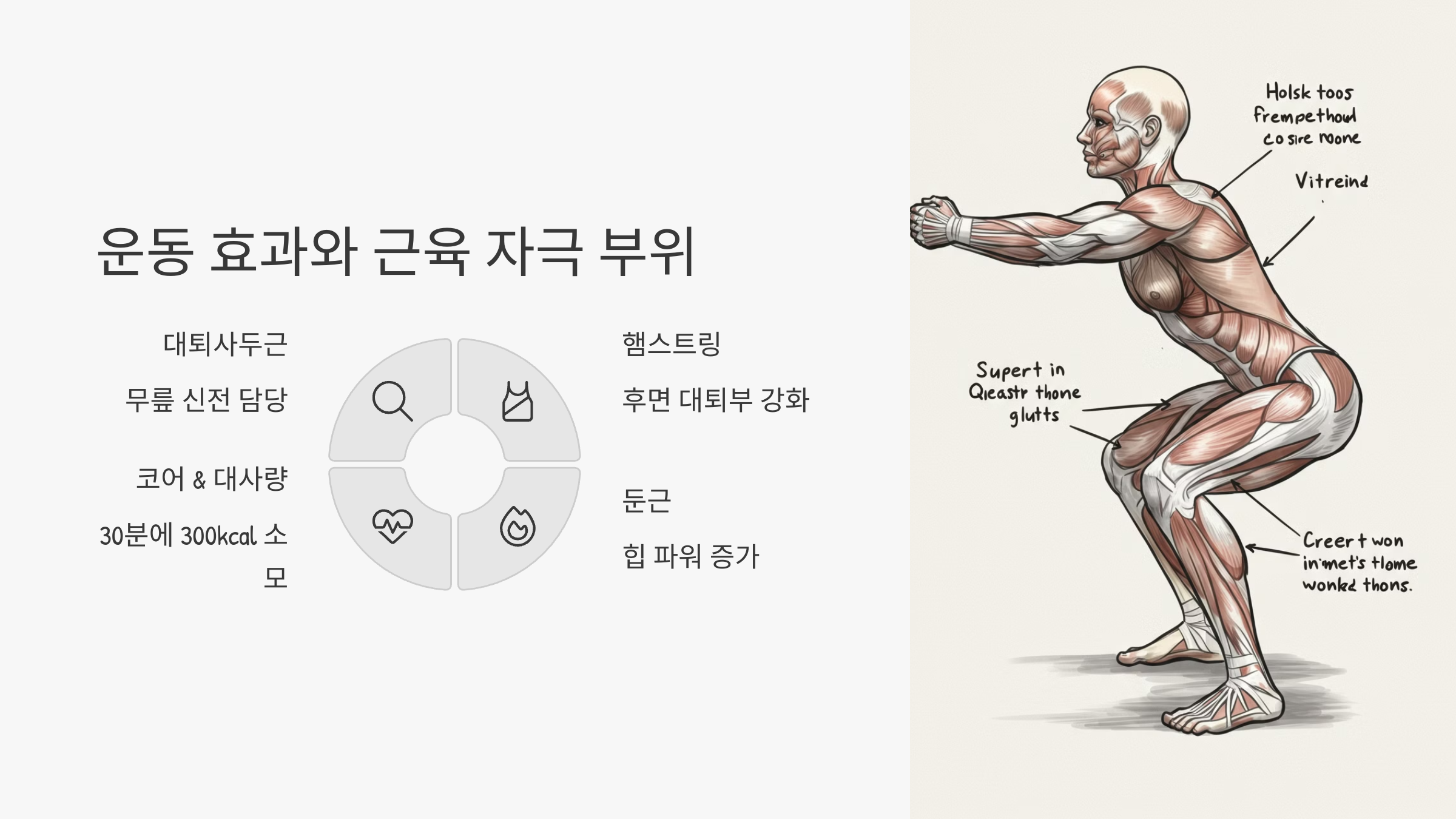 - 발 위치를 조금 앞으로 두면 엉덩이 자극, 뒤쪽으로 두면 허벅지 자극 강화