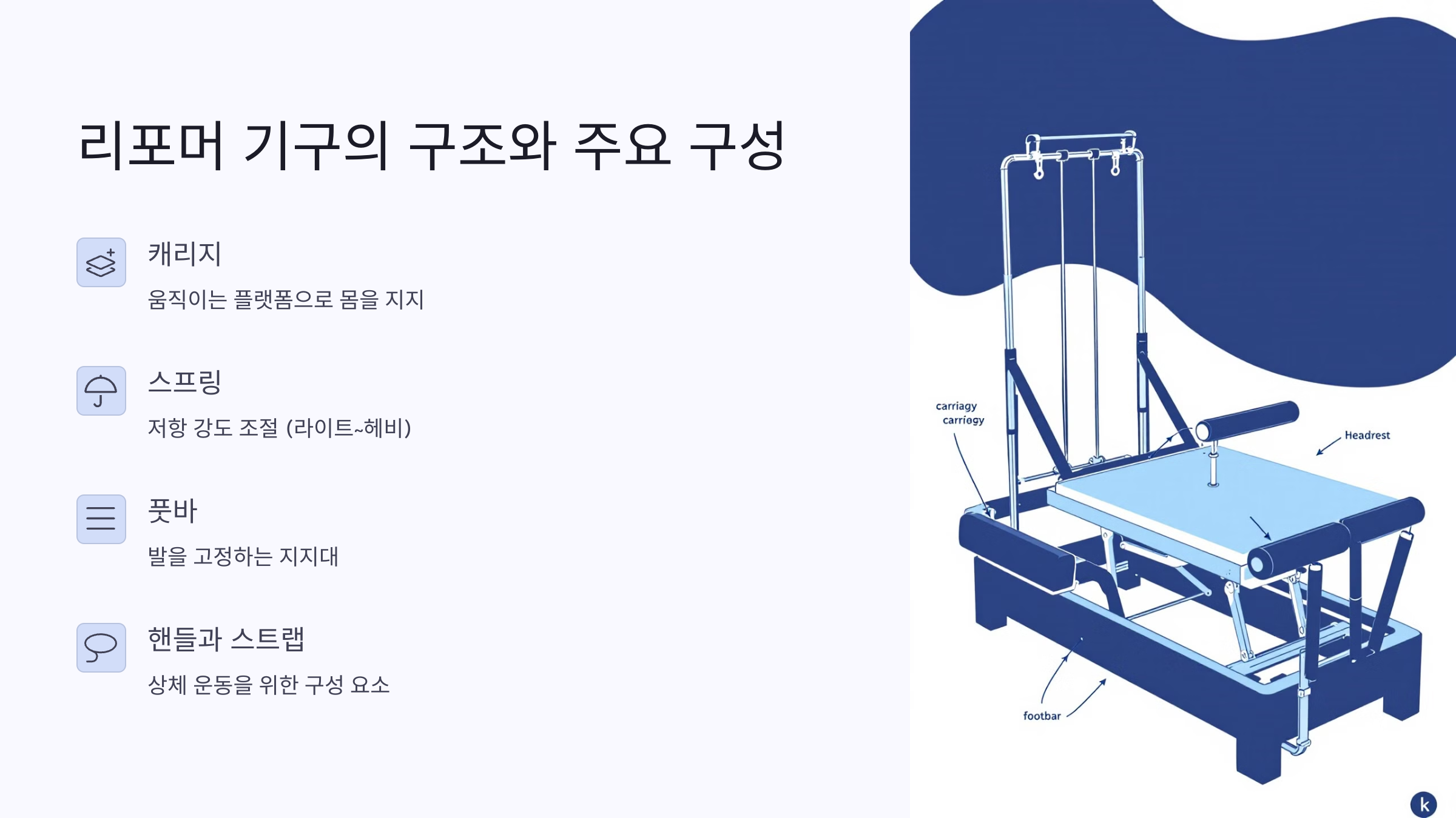 리포머 기구는 단순히 ‘침대처럼 생긴 기구’로 보이지만, 그 안에는 몸의 움직임을 섬세하게 조절해주는 다양한 장치들이 들어 있어요. 각각의 구성 요소는 특정 동작과 근육을 타겟팅하기 위해 정교하게 설계되어 있답니다.