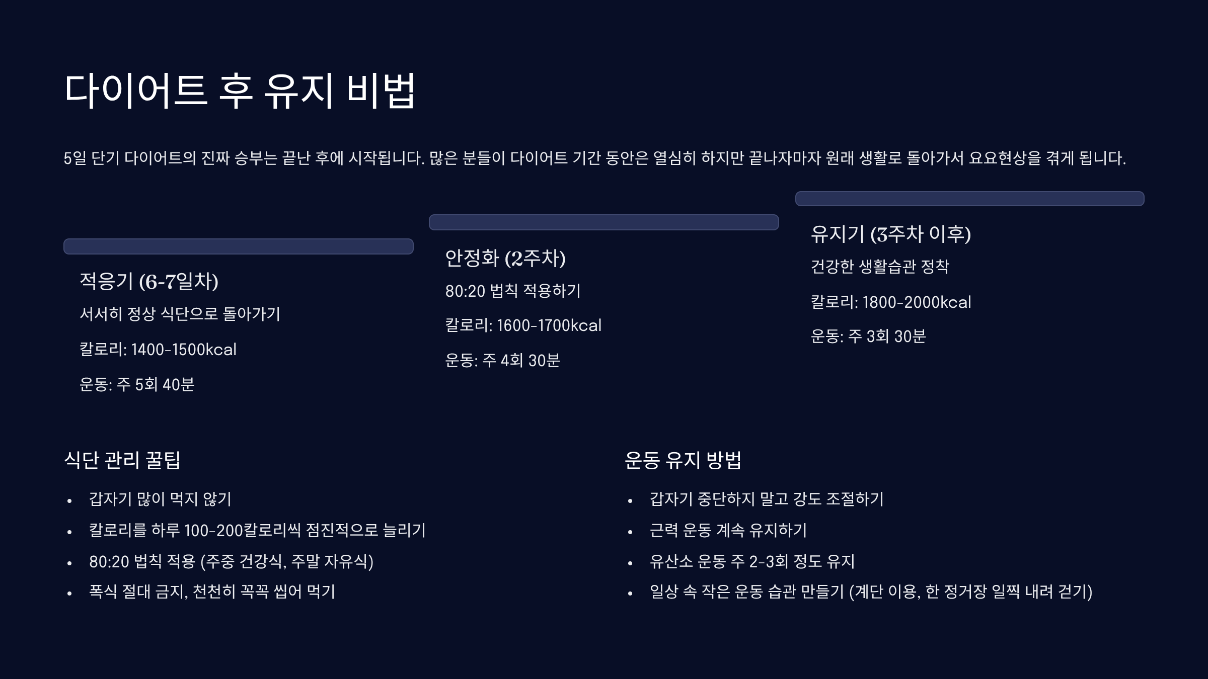5일 단기 다이어트의 진짜 승부는 끝난 후에 시작돼요. 많은 분들이 다이어트 기간 동안은 열심히 하지만 끝나자마자 원래 생활로 돌아가서 요요현상을 겪게 되거든요. 가장 중요한 것은 서서히 정상 식단으로 돌아가는 것이에요. 갑자기 많이 먹으면 위가 놀라서 소화불량이 올 수 있고, 혈당도 급격히 올라갈 수 있어요. 6일째부터는 칼로리를 하루 100-200칼로리씩 점진적으로 늘려가세요.