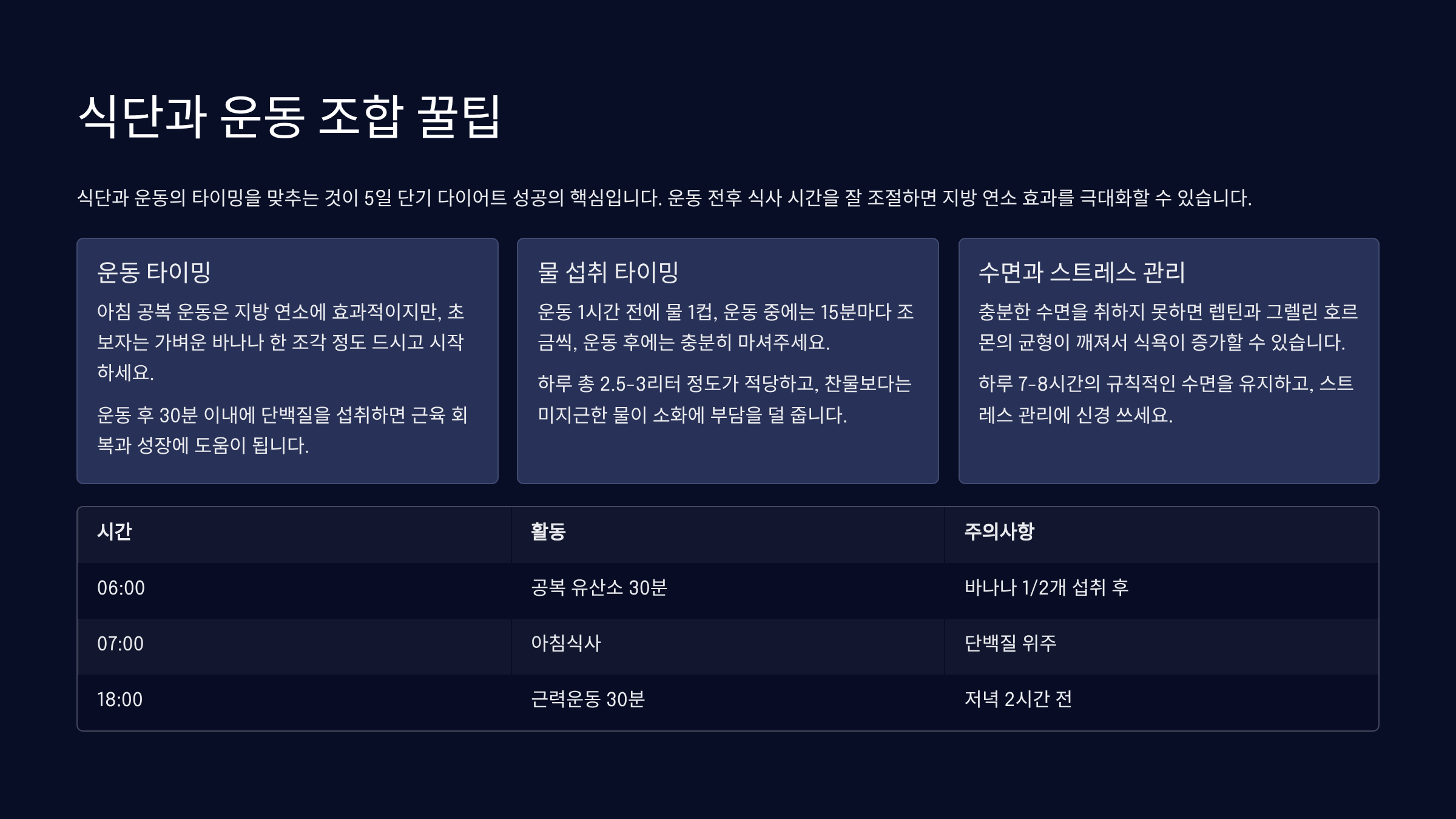 식단과 운동의 타이밍을 맞추는 것이 5일 단기 다이어트 성공의 핵심이에요. 운동 전후 식사 시간을 잘 조절하면 지방 연소 효과를 극대화할 수 있어요. 아침 공복 운동은 지방 연소에 매우 효과적이지만, 초보자에게는 부담이 될 수 있으니 가벼운 바나나 한 조각 정도는 드시고 시작하세요. 운동 후 30분 이내에 단백질을 섭취하면 근육 회복과 성장에 도움이 돼요.
