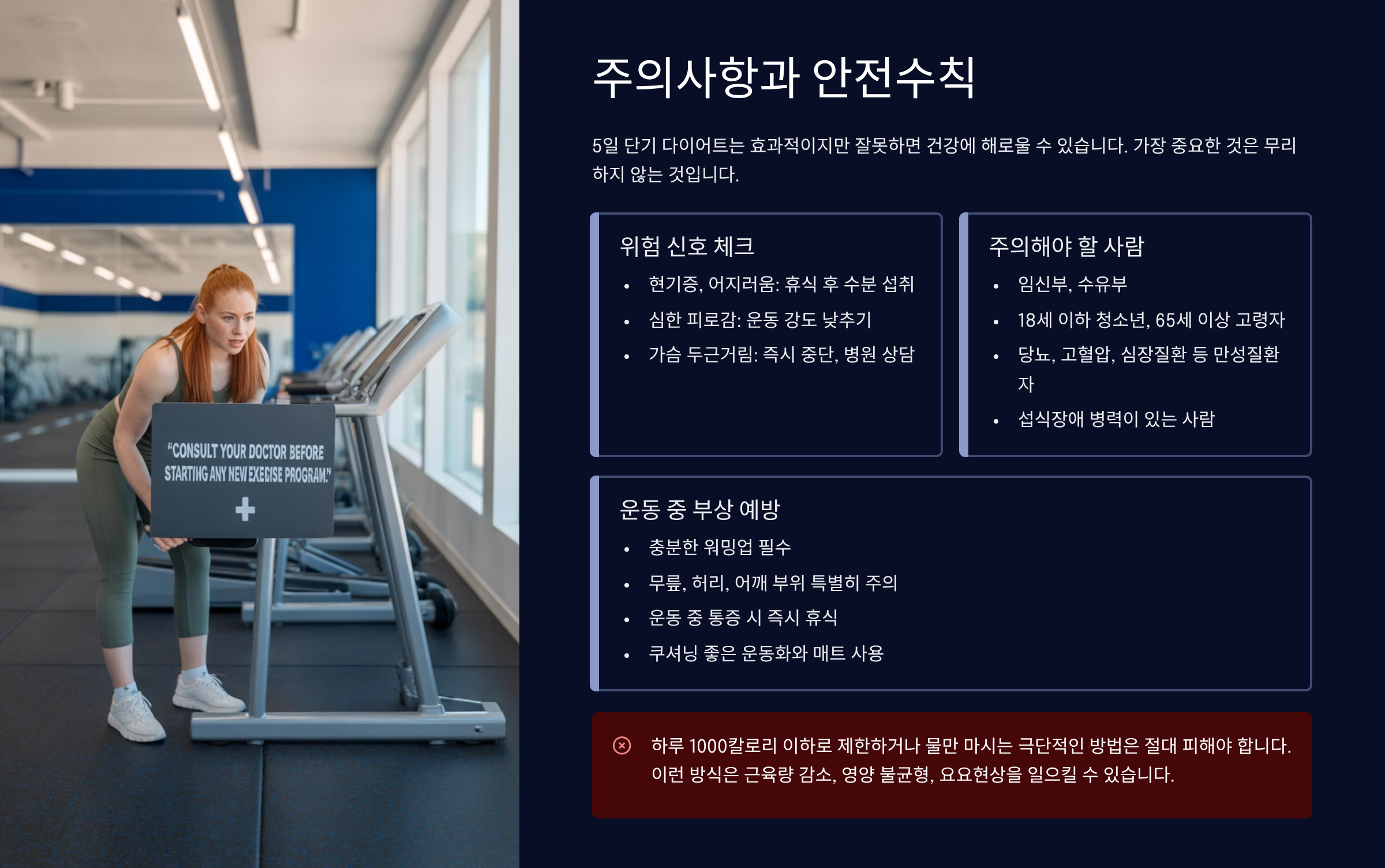 5일 단기 다이어트는 효과적이지만 잘못하면 건강에 해로울 수 있어요. 가장 중요한 것은 무리하지 않는 것이에요. 하루 1000칼로리 이하로 제한하거나 물만 마시는 극단적인 방법은 절대 피해야 해요. 이런 방식은 근육량 감소, 영양 불균형, 요요현상을 일으킬 수 있어요. 기존에 당뇨, 고혈압, 심장질환 등의 만성질환이 있으신 분들은 반드시 의사와 상담 후 시작하세요.