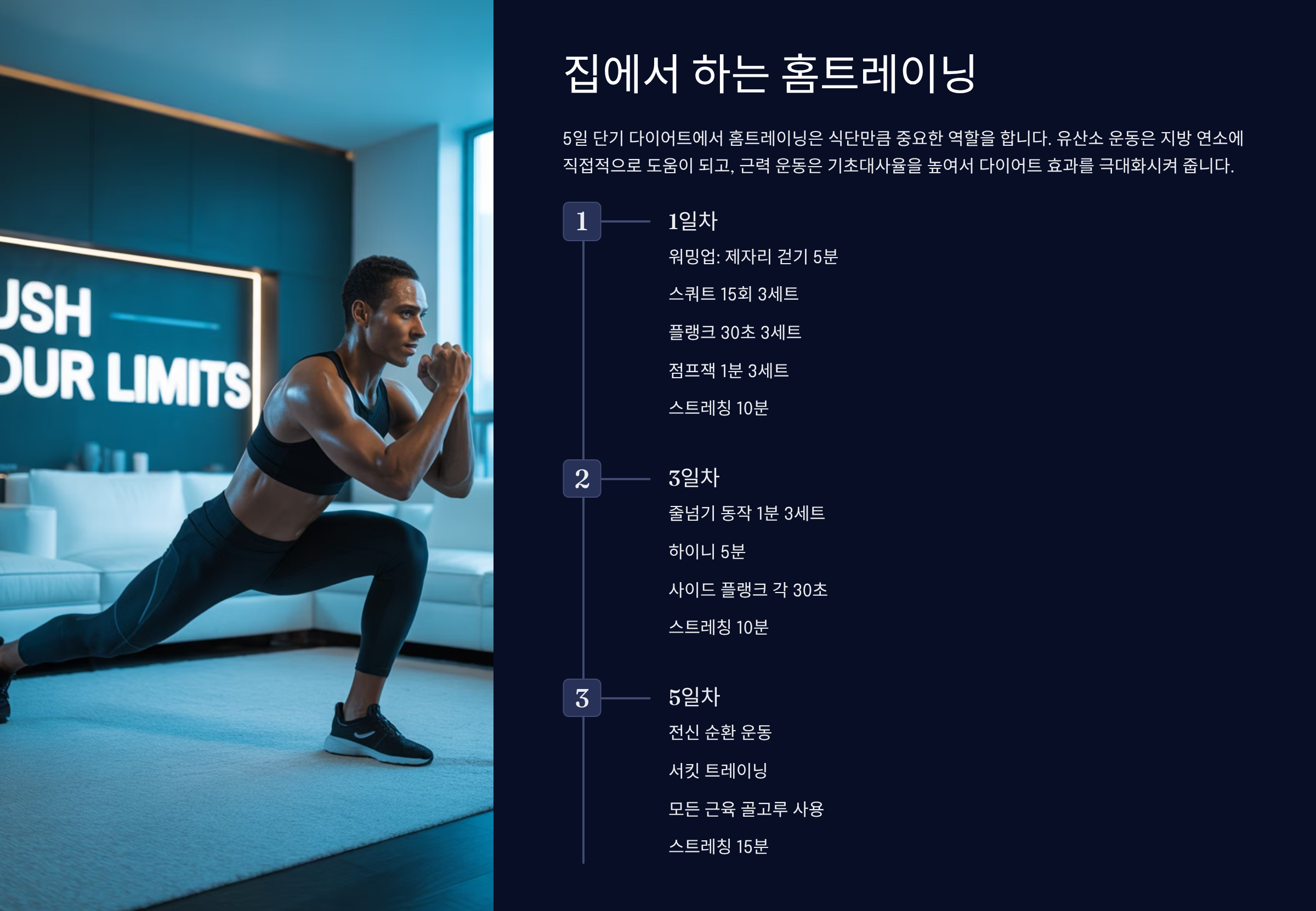 5일 단기 다이어트에서 홈트레이닝은 식단만큼 중요한 역할을 해요. 집에서 할 수 있는 운동은 크게 유산소 운동과 근력 운동으로 나누어져요. 유산소 운동은 지방 연소에 직접적으로 도움이 되고, 근력 운동은 기초대사율을 높여서 다이어트 효과를 극대화시켜 줘요. 하루 40-60분 정도 투자하면 식단 효과와 시너지를 낼 수 있어요.