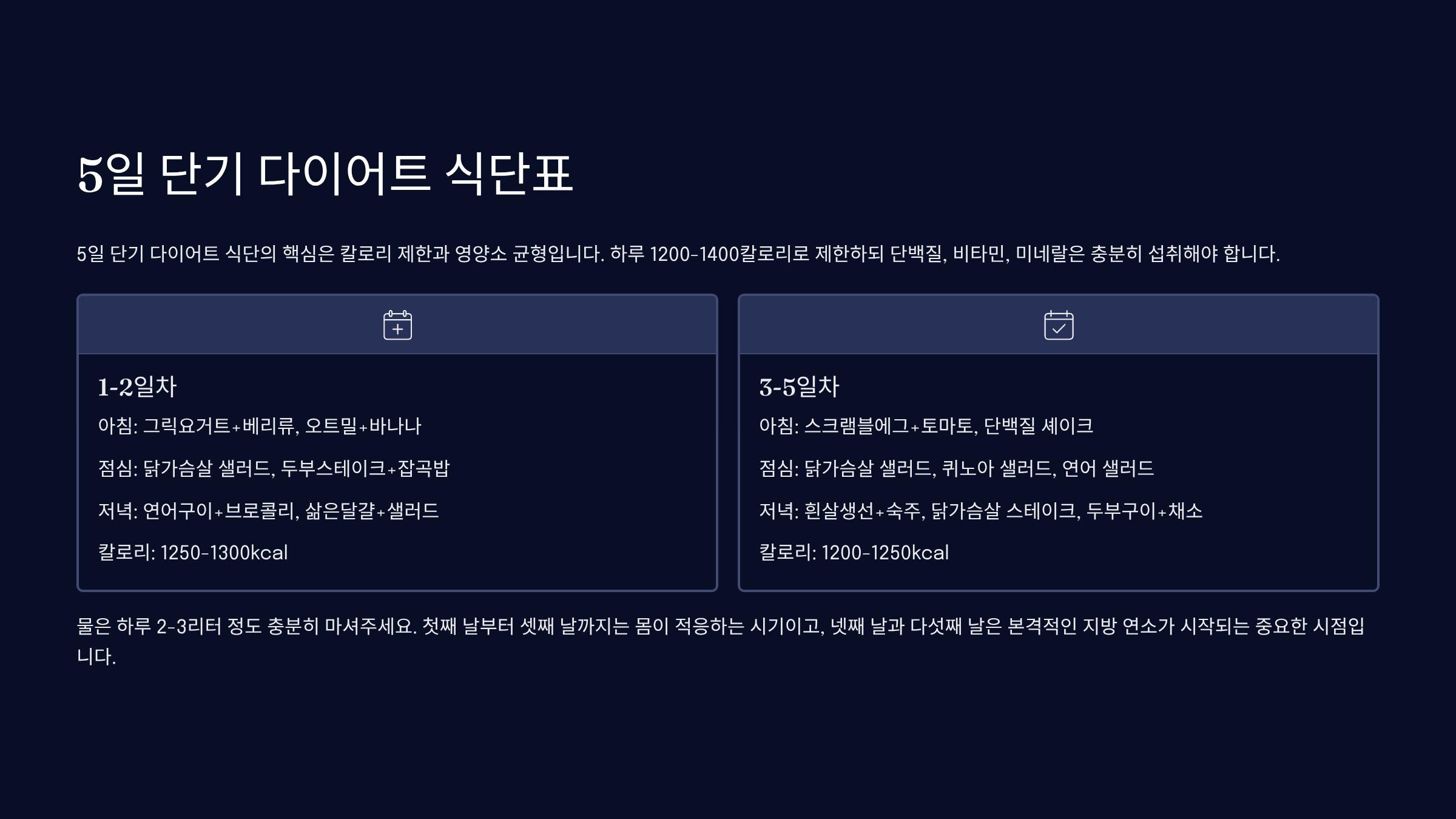 5일 단기 다이어트 식단의 핵심은 칼로리 제한과 영양소 균형이에요. 하루 1200-1400칼로리로 제한하되 단백질, 비타민, 미네랄은 충분히 섭취해야 해요. 첫째 날부터 셋째 날까지는 몸이 적응하는 시기이고, 넷째 날과 다섯째 날은 본격적인 지방 연소가 시작되는 중요한 시점이랍니다. 각 끼니마다 단백질 20-25g, 복합탄수화물 30-40g, 건강한 지방 10-15g을 목표로 구성하는 것이 좋아요.